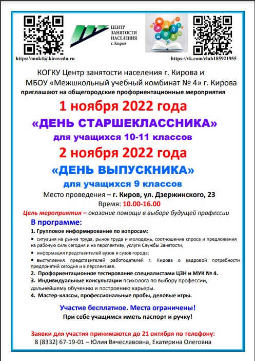 Осенние каникулы – отличное время для школьников, чтобы подумать о будущей профессии. В рамках взаимодействия с Центром занятости города Кирова 1 и 2 ноября 2022 года в МБОУ МУК № 4 прошли профориентационные мероприятия «ДЕНЬ СТАРШЕКЛАССНИКА» и «ДЕНЬ ВЫПУСКНИКА». Мероприятия Читать далее …