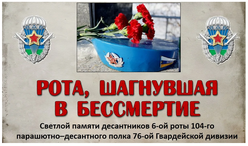 1 марта – ДЕНЬ ПАМЯТИ ВОИНОВ-ДЕСАНТНИКОВ 6-ой парашютно-десантной роты 104 гвардейского полка Псковской дивизии ВДВ, геройски погибших в Аргунском ущелье при проведении контртеррористической операции на территории Чечни
