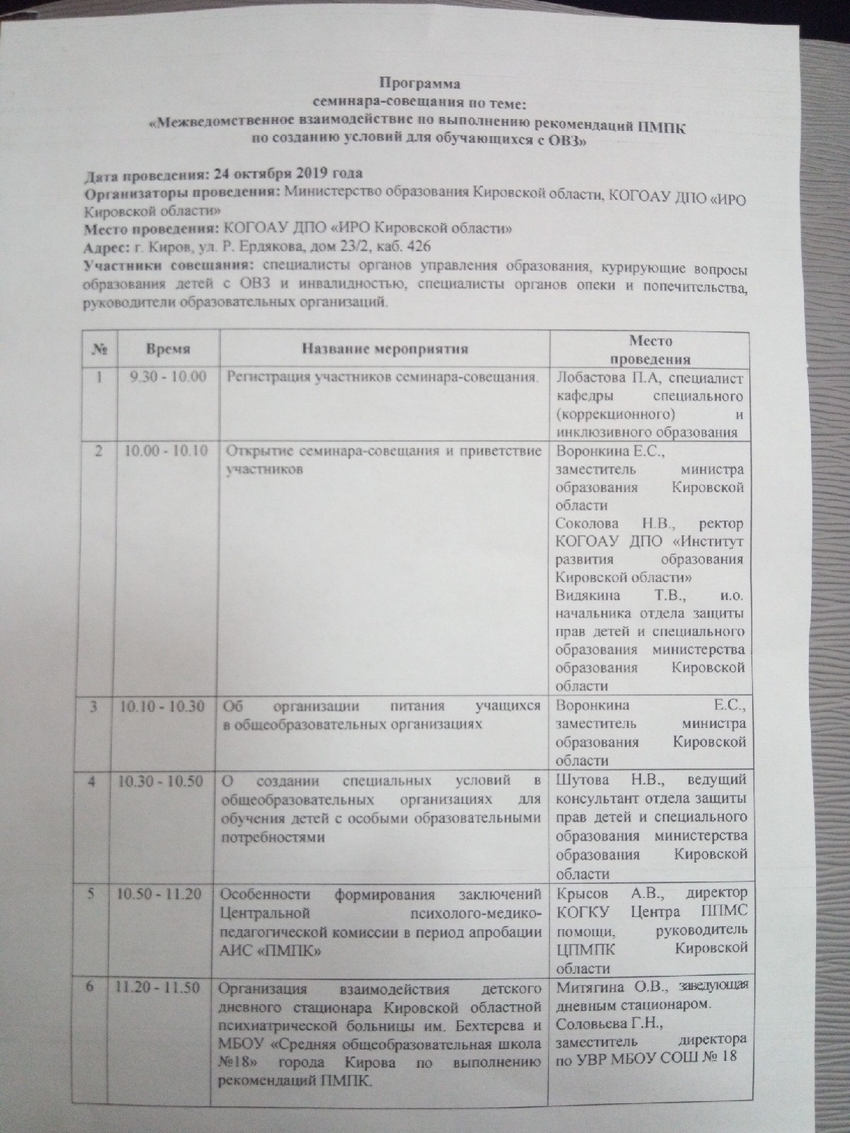 24 октября 2019 года заместитель директора по УВР Матушкина Е.Г. приняла участие в семинаре-совещании КОГОАУ ДПО «ИРО Кировской области» по теме «Межведомственное взаимодействие по выполнении рекомендаций ПМПК по созданию условий для обучающихся с ОВЗ»