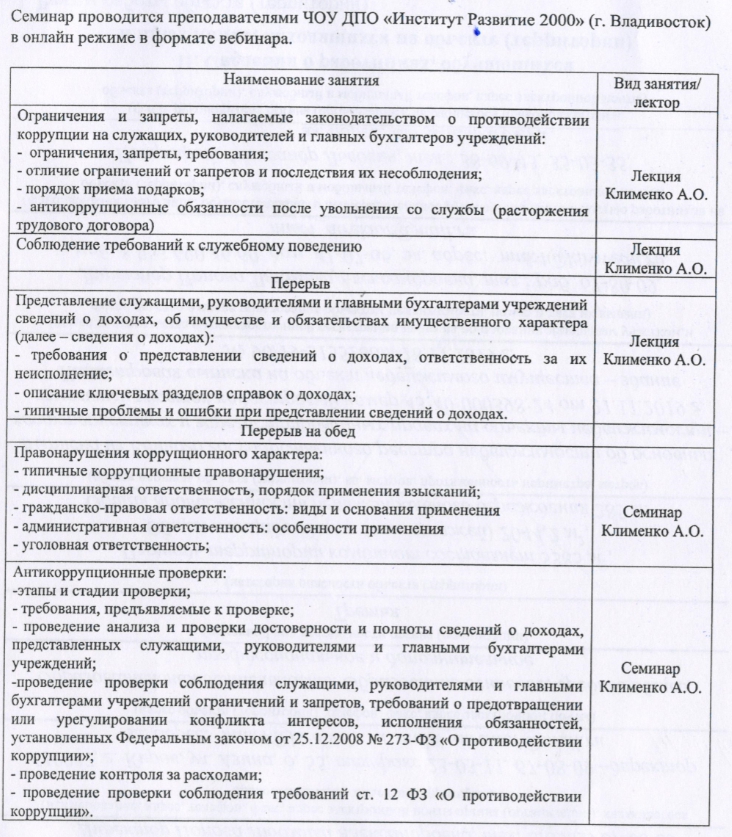 Наши сотрудники Власов Александр Иванович, Колобов Андрей Анатольевич — заместители директора по УВР, Порошина Екатерина Владимировна — инженер-программист, Шамова Лариса Николаевна — методист 10 февраля приняли участие в бесплатном обучающем мероприятии по противодействию коррупции, проведенном образовательным учреждением «Институт Развития 2000».