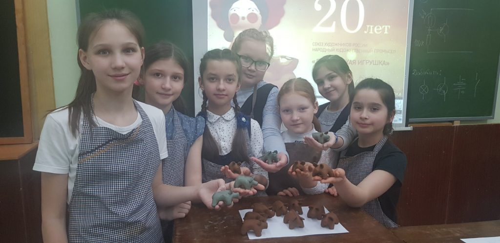 На фото работа учащихся над созданием игрушки «Дымковская свинка»