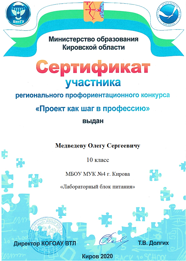 Сертификат участника регионального профориентационного конкурса «Проект как шаг в профессию» получил Медведев Олег, учащийся 10 класса, проект «Лабораторный блок питания», руководитель проекта, учитель технологии МБОУ МУК №4 города Кирова Счастливцев Борис Борисович.