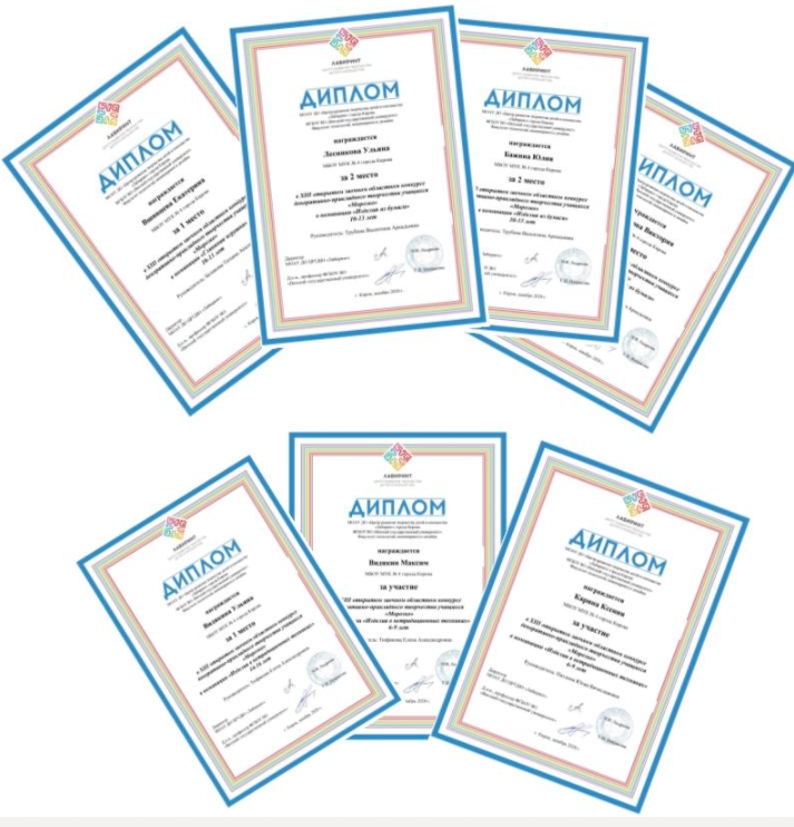 — диплом за участие получил самый младший ученик Видякин Максим, руководитель – Тюфякова Елена Александровна. Максим смастерил новогоднюю игрушку из подручных материалов, он умело использовал материалы от пластиковых бутылей, пуговиц и мишуры;