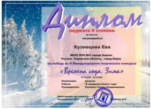 Ученица 11 класса МБОУ МУК № 4 г. Кирова Кузнецова Ева представила работу «В ожидании Нового года» и получила Диплом ІІ степени в конкурсном направлении «Рисунок».