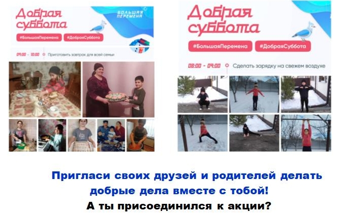 22 января 2021 года в сообществе Всероссийского конкурса для школьников «Большая перемена» сети ВКонтакте стартовала Всероссийская акция «Добрая суббота». Инициаторами акции выступили участники «Большой перемены», они предложили всем школьникам и их родителям начать новый год с добрых дел и полезных привычек.