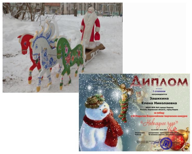 Мы рады поздравить педагога МБОУ МУК № 4 Зашихину Елену Николаевну с получением диплома I степени Всероссийского творческого конкурса «Новогоднее чудо».
