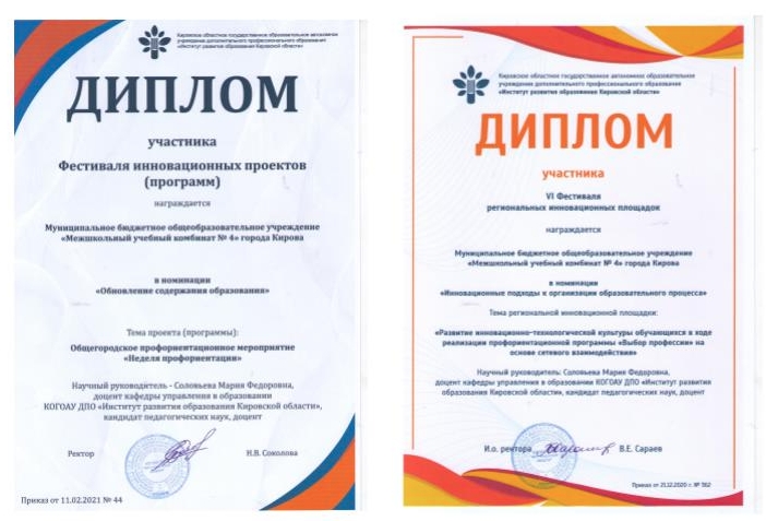— 21.12.2020 в VI Фестивале региональных инновационных площадок в номинации «Инновационные подходы к организации образовательного процесса», где представили опыт работы нашей Региональной инновационной площадки по реализации проекта «Развитие инновационно-технологической культуры обучающихся в ходе реализации профориентационной программы «Выбор профессии» на основе сетевого взаимодействия (для учащихся 5-11 классов общеобразовательных школ города Кирова)».