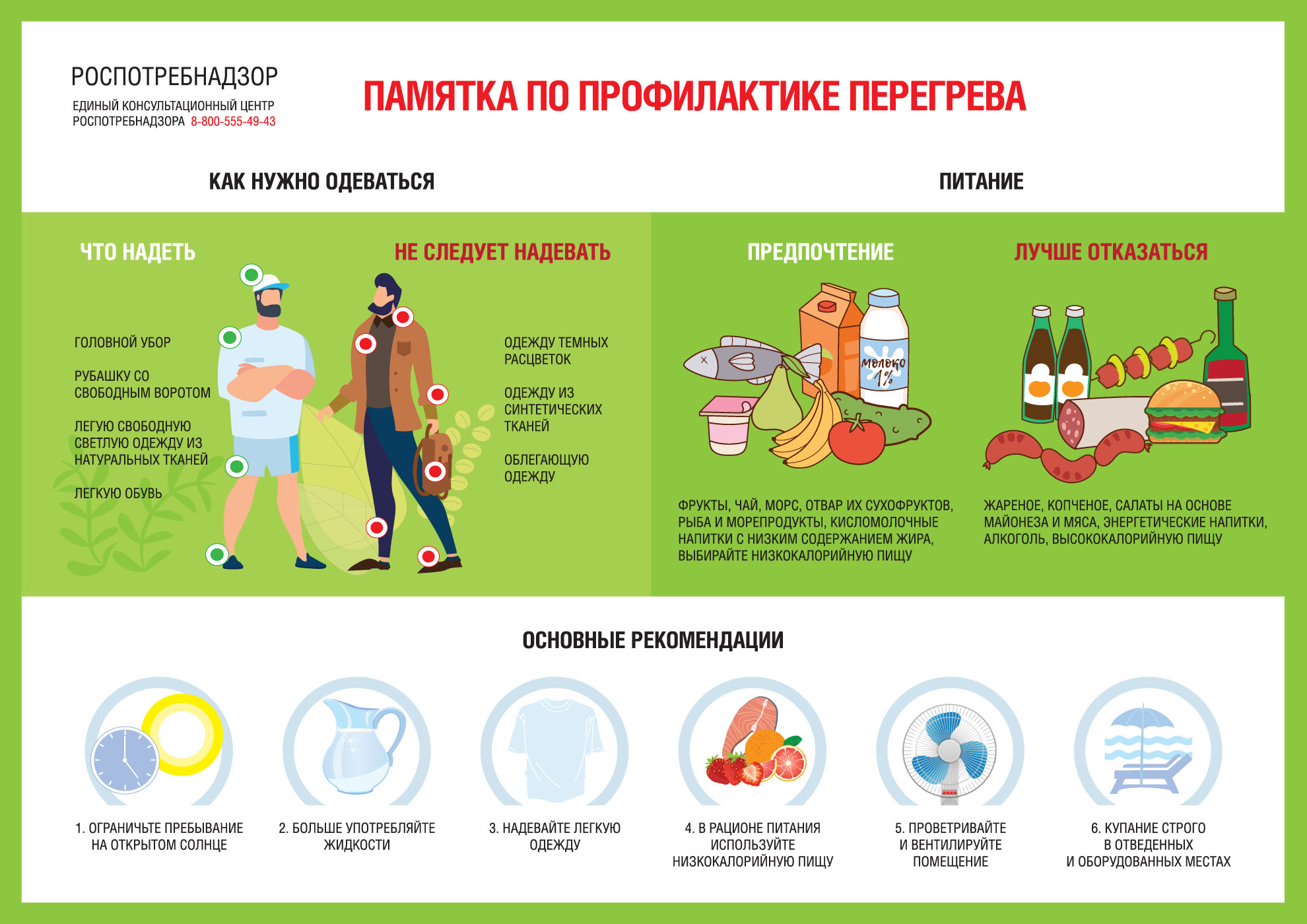 2. ОДЕЖДА. При выходе на улицу рекомендуется надевать легкую одежду из натуральных тканей светлой расцветки, желательно, чтобы ворот одежды был не тугим, на улице обязательно пользоваться головным убором (летняя шляпа, панама, платок и т.п.), солнцезащитными очками, зонтиками.