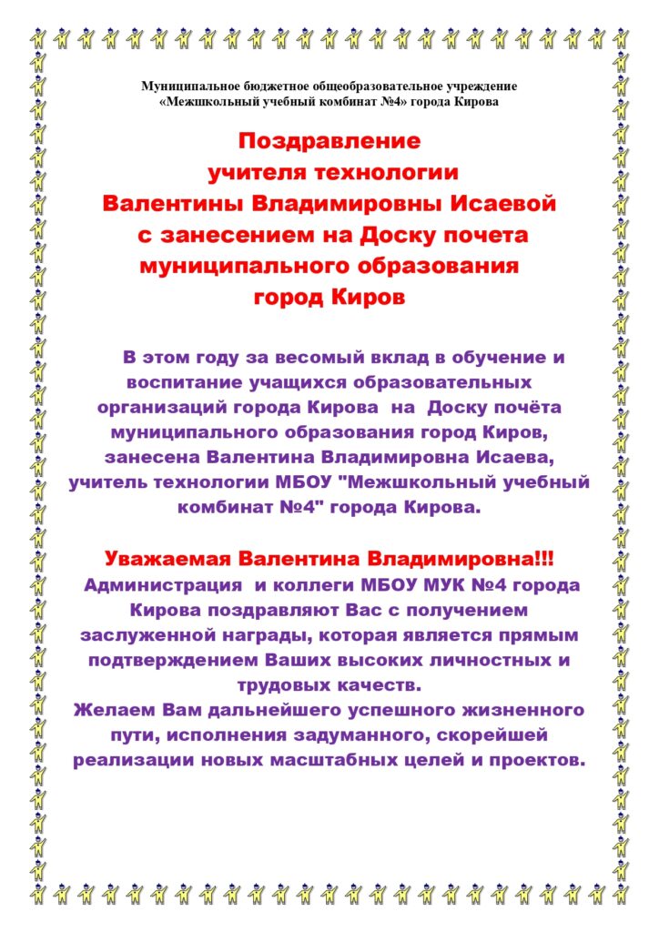 Поздравление учителя технологии МБОУ МУК №4 города Кирова, Валентины Владимировны Исаевой с занесением на Доску почета муниципального образования город Киров.