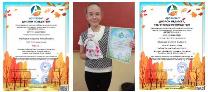 Поздравляем Жуйкову Марьяну, ученицу 6 класса МБОУ МУК №4 ‒ победителя Международного конкурса «Здравствуй, осень!» и нашего педагога Корюкову Елену Львовну за подготовку и активную работу по развитию творческих способностей учащихся.