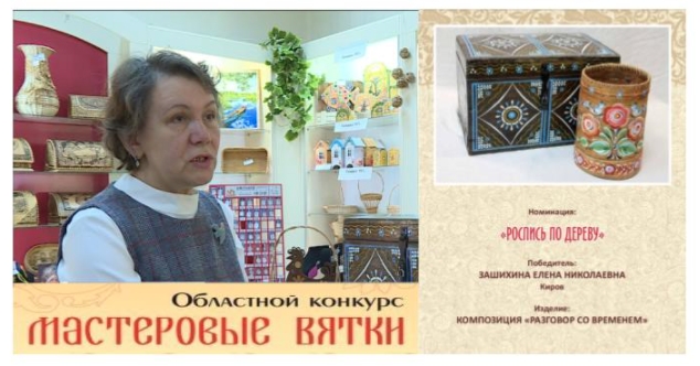 Победителем в категории мастеров номинации «Роспись по дереву» стала педагог МБОУ МУК № 4 Зашихина Елена Николаевна, мастер народных промыслов Кировской области.