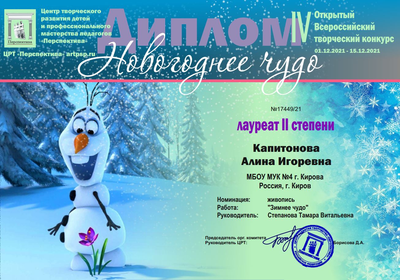 — Капитонову Алину за 2 место в номинации «Живопись», руководитель – Степанова Тамара Витальевна. Работа «Зимнее чудо».