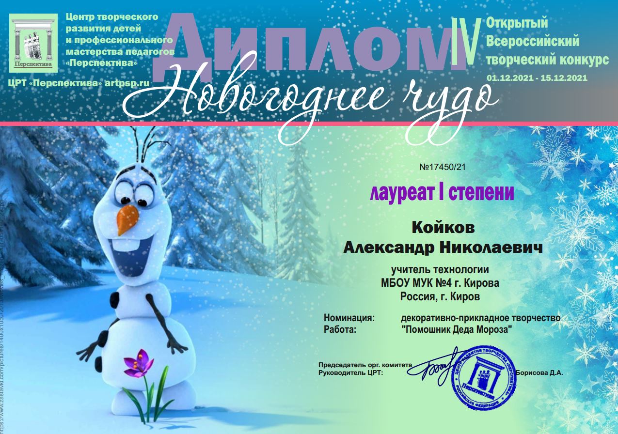 — Койкова Александра Николаевича за 1 место в номинации «Декоративно-прикладное творчество», работа «Помощник Деда Мороза».