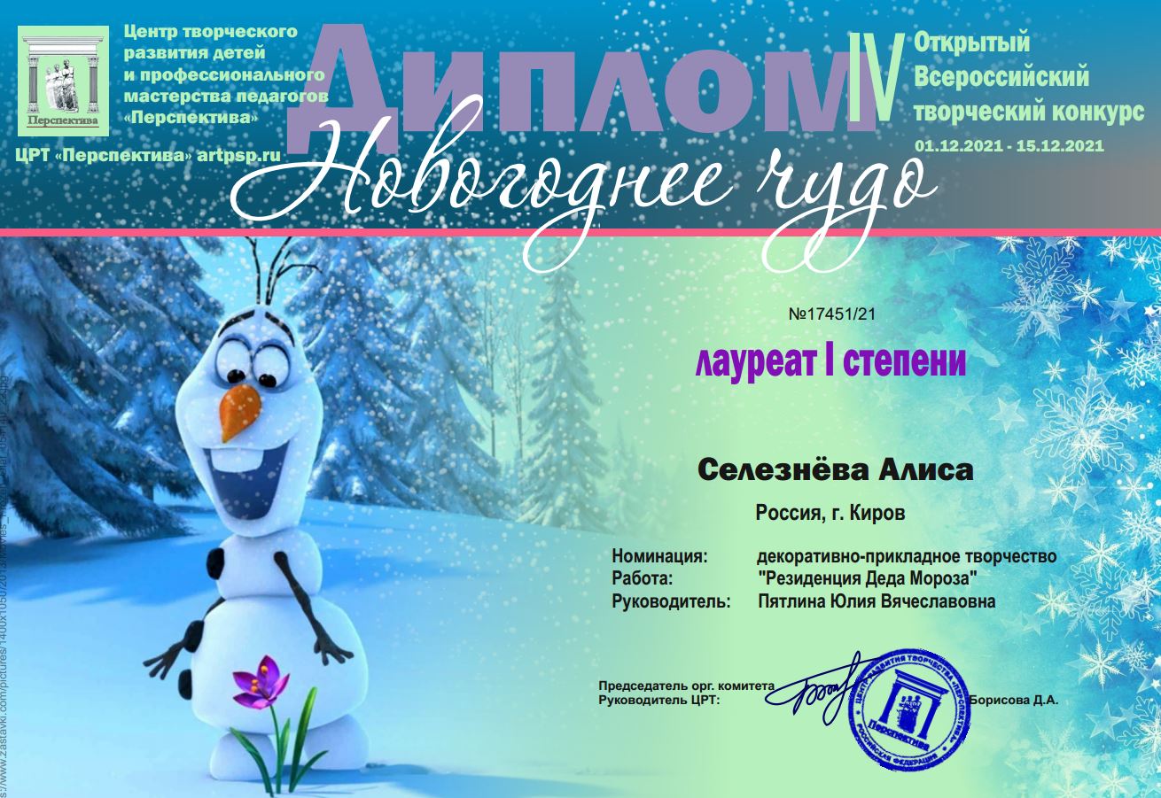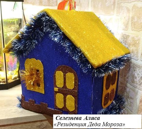 — Селезневу Алису за 1 место в номинации «Декоративно-прикладное творчество», работа «Резиденция Деда Мороза», руководитель – Пятлина Юлия Вячеславовна.