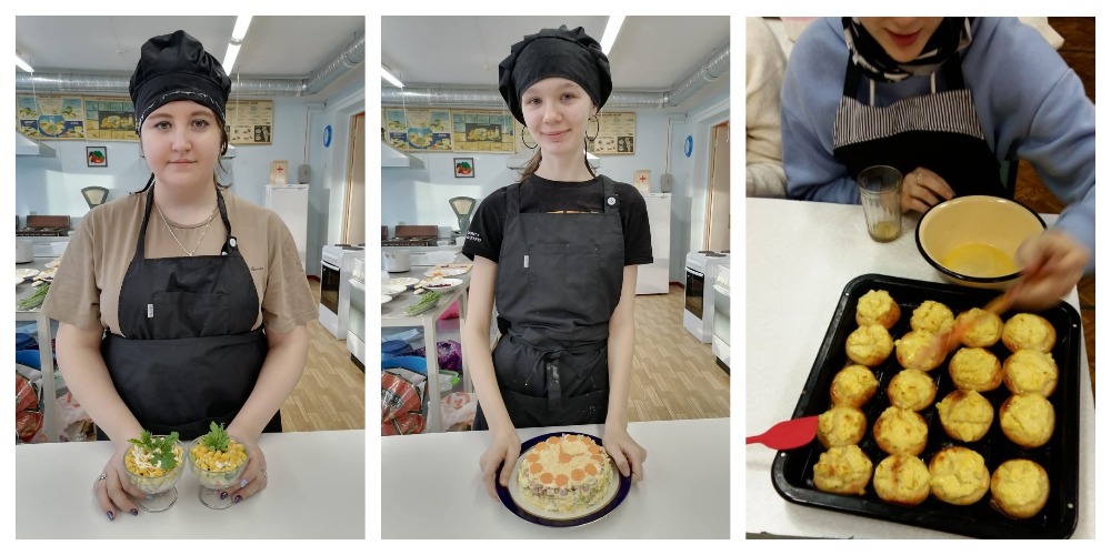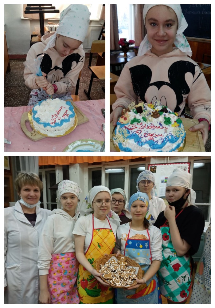 Это авторские блюда от наших учеников объединений «Кулинария». Красивое оформление праздничных салатов, вкусные ватрушки, имбирное печенье, а на десерт – вкуснейший торт, сделанный своими руками!