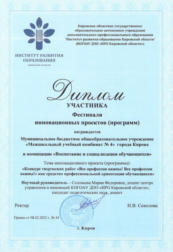 Одно из мероприятий – ежегодный ФЕСТИВАЛЬ ИННОВАЦИОННЫХ ПРОЕКТОВ (программ), где мы представляли свой проект «Конкурс творческих работ «Все профессии важны! Все профессии нужны! как средство профессиональной ориентации обучающихся».