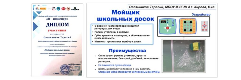 В конкурсе «Я – инженер» в номинации «Производство» принял участие ученик 6 класса МБОУ МУК № 4 г. Кирова Овсянников Тарасий.