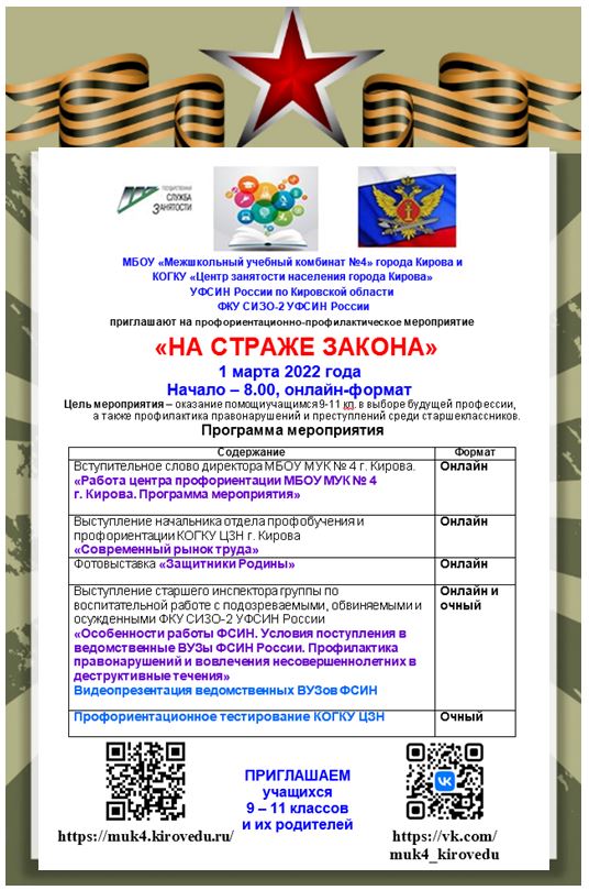 ВНИМАНИЕ! ПРИГЛАШАЕМ 1 марта 2022 года принять участие в профориентационно-профилактическом мероприятии «НА СТРАЖЕ ЗАКОНА» 25.02.2022 muk4