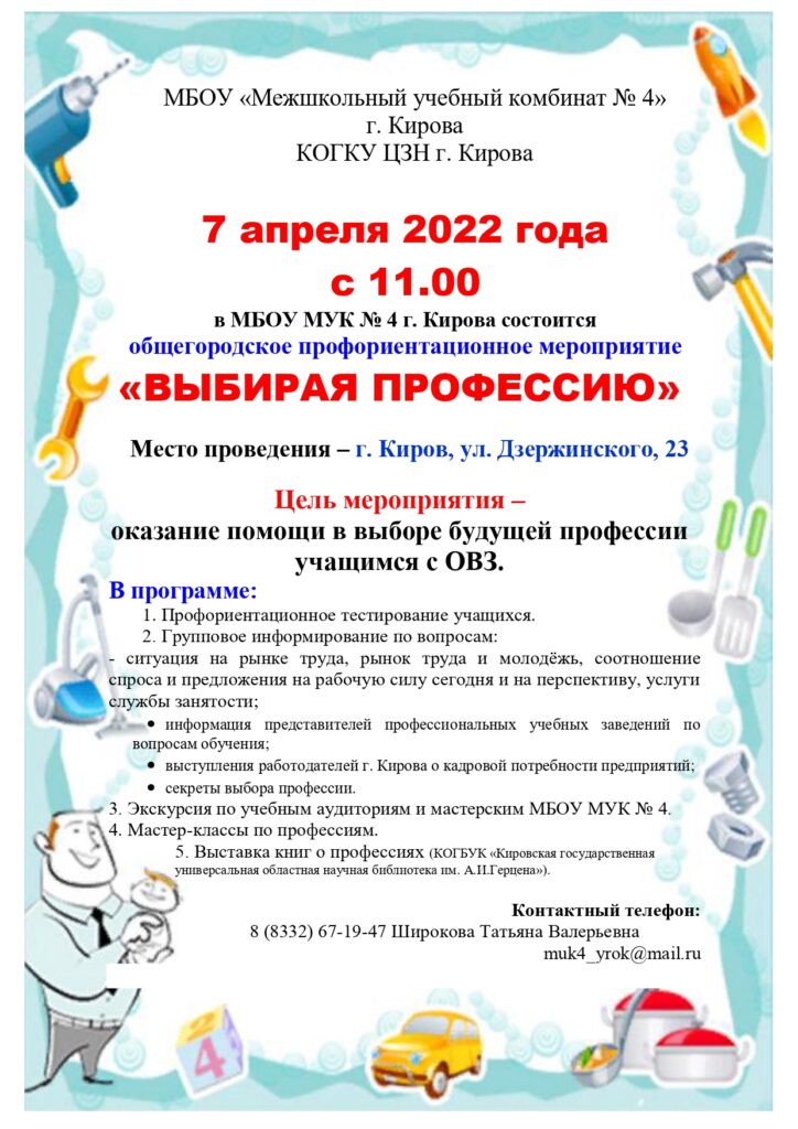 7 апреля 2022 года в МБОУ «Межшкольный учебный комбинат № 4» г. Кирова проводится общегородское профориентационное мероприятие для учащихся с ОВЗ «ВЫБИРАЯ ПРОФЕССИЮ».