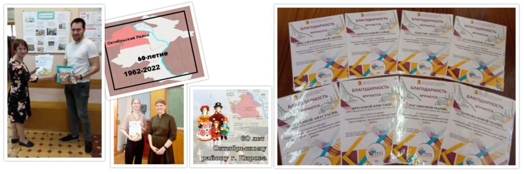 Все участники, принявшие участие в конкурсе творческих работ к 60-летию Октябрьского района города Кирова, награждены памятными призами и благодарностями.