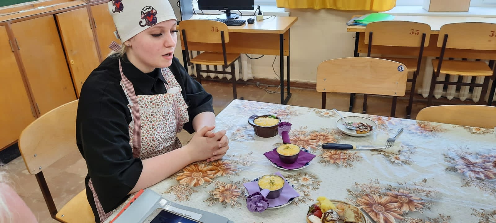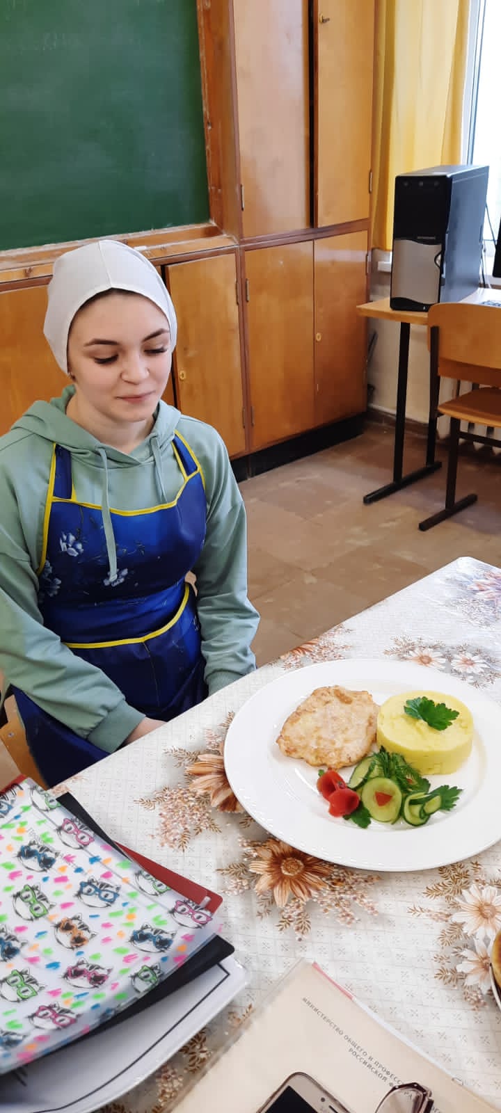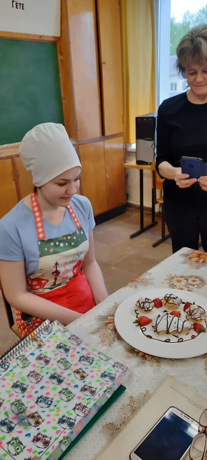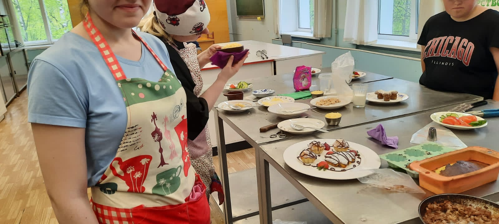 Сегодня готовили сырники, жульен, фаршированные блины, картофельный рулет с мясом, картофельное пюре с мясной котлетой и бризоль с картофельным пюре, манник и пирожное «Картошка». Было вкусно и красиво подано, аппетитные запахи и оригинальное оформление привлекали внимание.