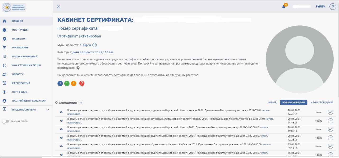 После того как семья получила сертификат, она может войти с использованием указанного на сертификате логина и пароля в личный кабинет ребенка на портале https://43.pfdo.ru/, в котором отражается количество услуг дополнительного образования, закрепленных за сертификатом. Просим обратить внимание, что в первую очередь сертификат – это количество бюджетных услуг дополнительного образования, которые может получить ребенок. Количество таких услуг обозначается цифрами, которую можно посмотреть в личном кабинете.